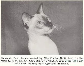 R.M. Gr. Ch. Gidgetta of Cyreccia (see photo below) was another very influential chocolate point queen found in lots of old-style and show-style pedigrees. She was bred by Sue McNally, but her sire was a Green Lane cat, Gr. Ch. Green Lane Van of Velvet Shadow.