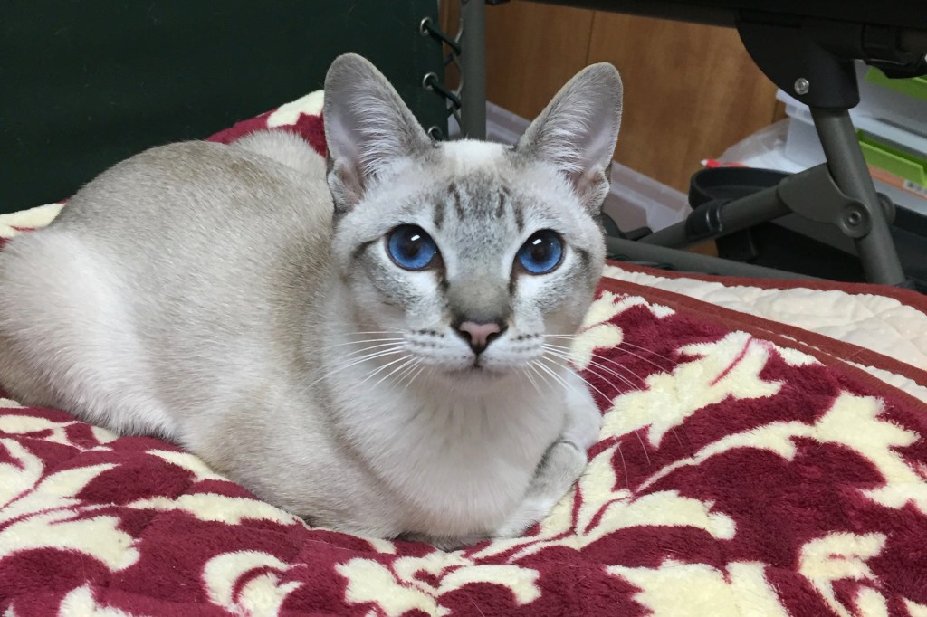 ThaiDi Aslankitty the Lionheart, is a big blue point fellow whose father, blue point Mingo Tia Lynn, from Sandypoints cattery near Philadelphia, is descended from old Pennsylvania Siamese lines. Aslan’s mother, Tonopah Aithra, is a lilac point from an old California Siamese cattery.